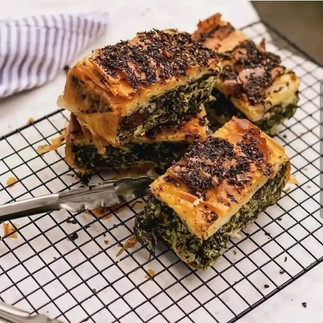 windows feels instantly welcoming, and the aroma of pastries and ground coffee as I open the door is divine. The glass counter houses slabs of freshly made Spanakopita which is packed with spinach and feta between layers of golden filo pastry, vegan sausage rolls, salads, scones, and a host of sweet treats.