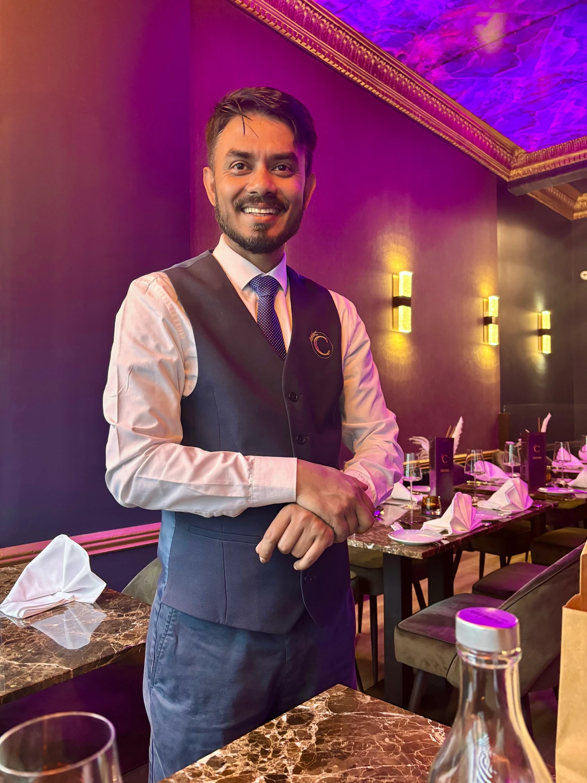 Opened in April 2025, Celestia pairs modern Indian cooking with sleek, atmospheric interiors: emerald banquettes, purple and amber lighting, a sculptural chandelier, and spicy‑brown marbled tables that glow warmly on a dull Edinburgh afternoon.