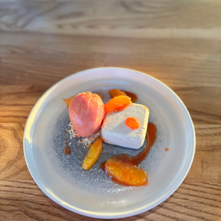 We’re full to the gills but share a Semifreddo with Coconut & Blood Orange reckoning it the lightest option among a line-up of Scottish cheese, sticky toffee pudding and ice‑cream. It’s a sophisticated, superlative dessert: cold cream folded with generous coconut, sweetness coming mainly from juicy segments of seasonal orange and a raspberry sorbet.