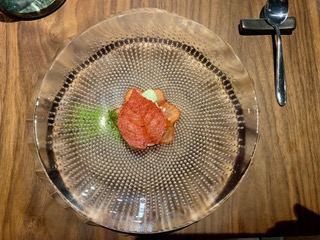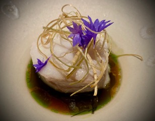 There’s no a la carte, only the nine-course tasting menu - which starts at 7 pm and ends at least three hours later. If this sounds daunting, believe me, it isn’t: I can’t think of a better way for chef and his tiny kitchen brigade to present the spectacle that is to come. The artfully lit stone-and-wood restaurant is full with 16 diners from Belgium, Germany and Fife, and we each have a table from which we can view proceedings in the bright well-organised open kitchen - right down to sous-chef Huw at the Pass painstakingly counting out the exact number (seven) of tiny pickled heritage apple balls into each bowl of Chawanmushi - a turnip and miso steamed custard dotted thrice with turnip top oil and decorated with tiny sweet cicely leaves. Meanwhile, we’re being served a cool crab noodle salad: Daikon “noodles” of homegrown radish compressed in-house ponzu with picked white crabmeat, white soy and lime. Its consommé of crab shells steeped like a tea in Korean mint, ginger, hyssop and other delicate flavours is so gently aromatic that you simply cannot bear to rush it.