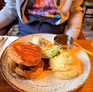 Mr Bite is equally content with his Steak Pie: mash, gravy and Hispi cabbage on the side, and inside the pie itself big, tender chunks of beef in puff‑pastry. It’s the kind of classic that lands exactly where it should.